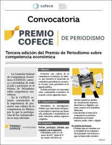Lograr que la cultura de la competencia permee al mayor número de personas requiere de la participación de todos. Para sumar esfuerzos la Comisión instituyó una serie de Premios COFECE que promueven los principios y beneficios de esta política pública. Con ellos, invitamos a estudiantes, académicos, investigadores, periodistas y al público en general, a participar en este esfuerzo por promover los beneficios de la competencia.
